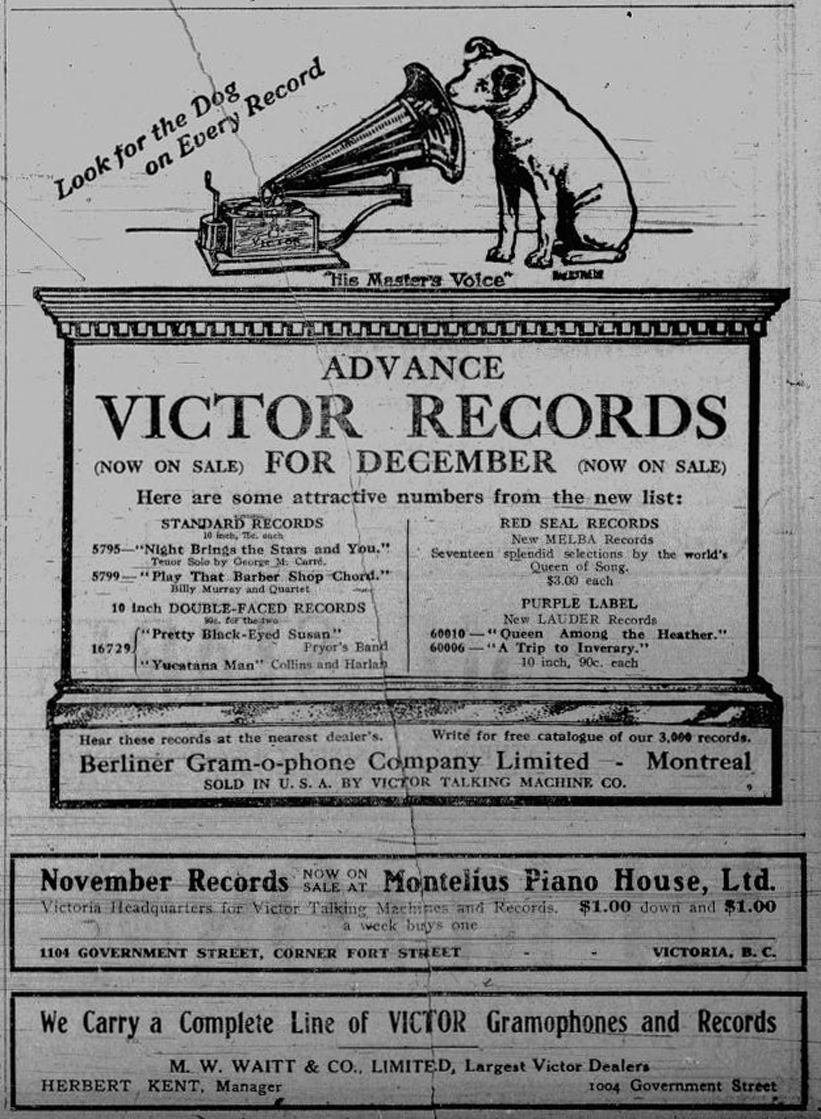 As part of our series on Historic Victoria Advertisements, Music, 1910-1919 here is a 1910 advertisement for Victor Records, sold at the Montelius Piano House Ltd., 1104 Government Street, and M.W. Waitt & Co. Ltd., 1004 Government Street.
