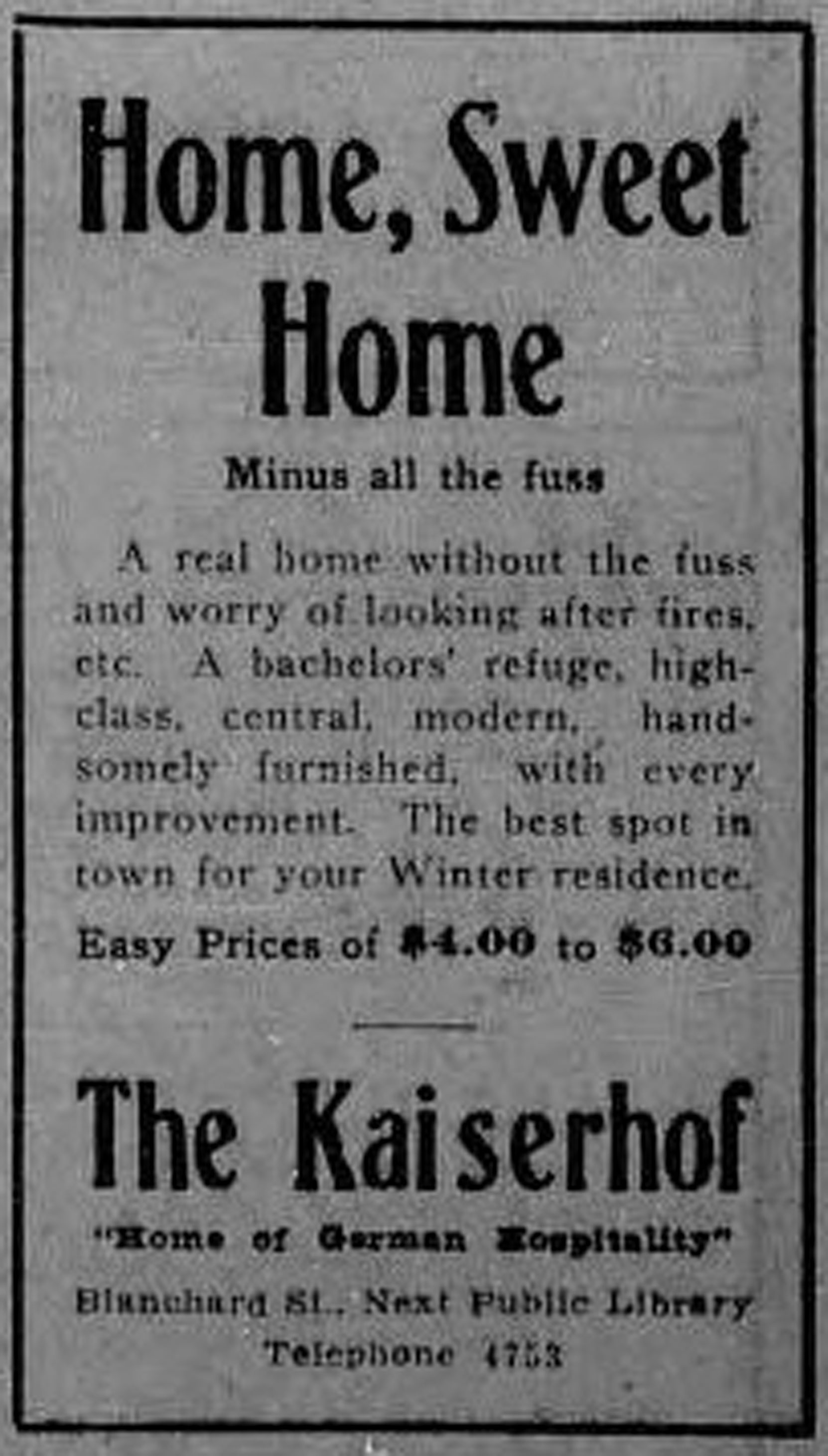 1913 advertisement for The Kaiserhof, 1320-1322 Blanshard Street. Notice the "bachelors' refuge", indicating the market The Kaiserhof was trying to attract. (Victoria Online Sightseeing Tours collection)