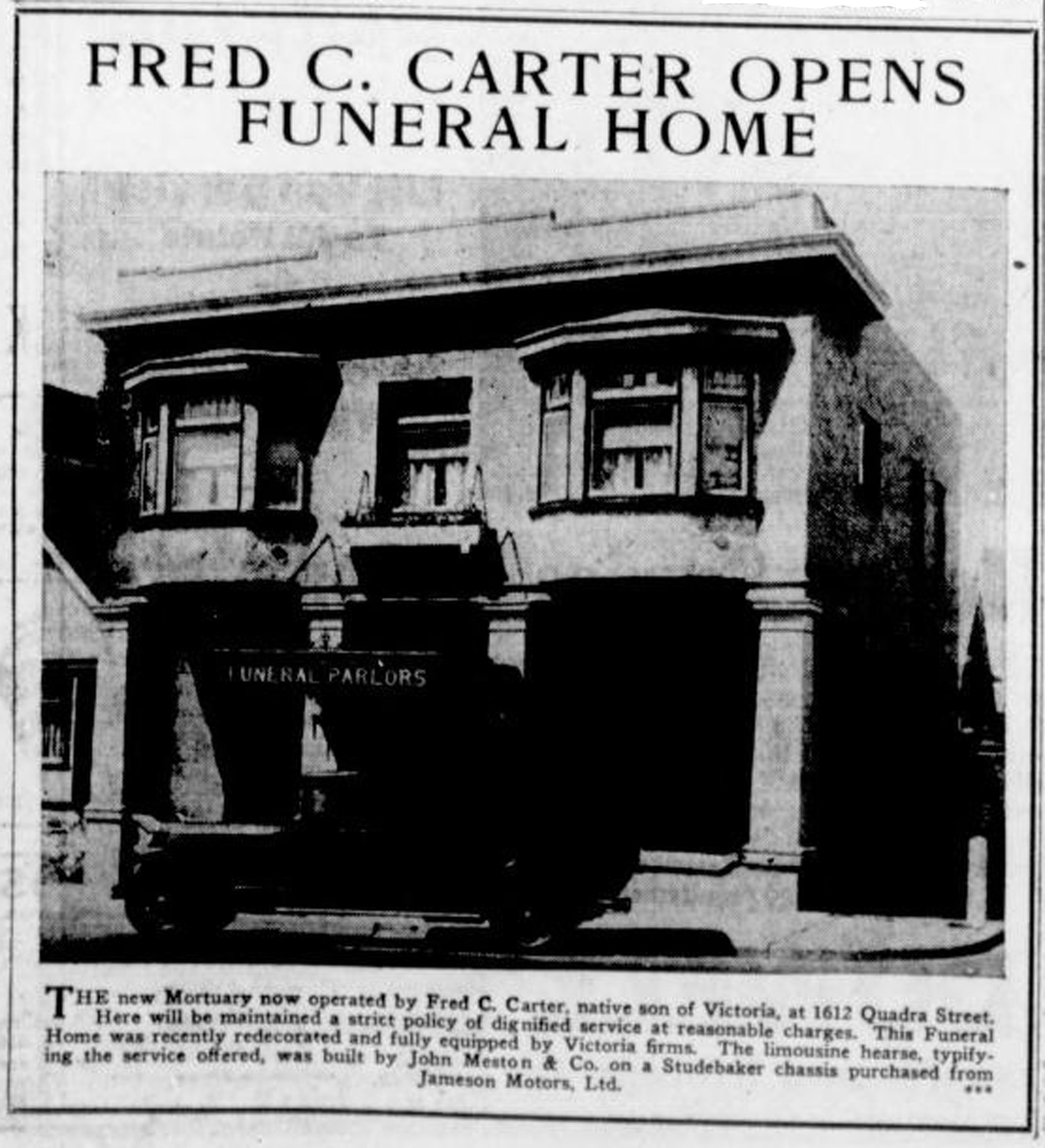 As part of our series on Historic Victoria Advertisements, Buildings, here is a 1933 advertisement for the Fred C. Carter Funeral Home, whose building is still standing at 1612 Quadra Street.