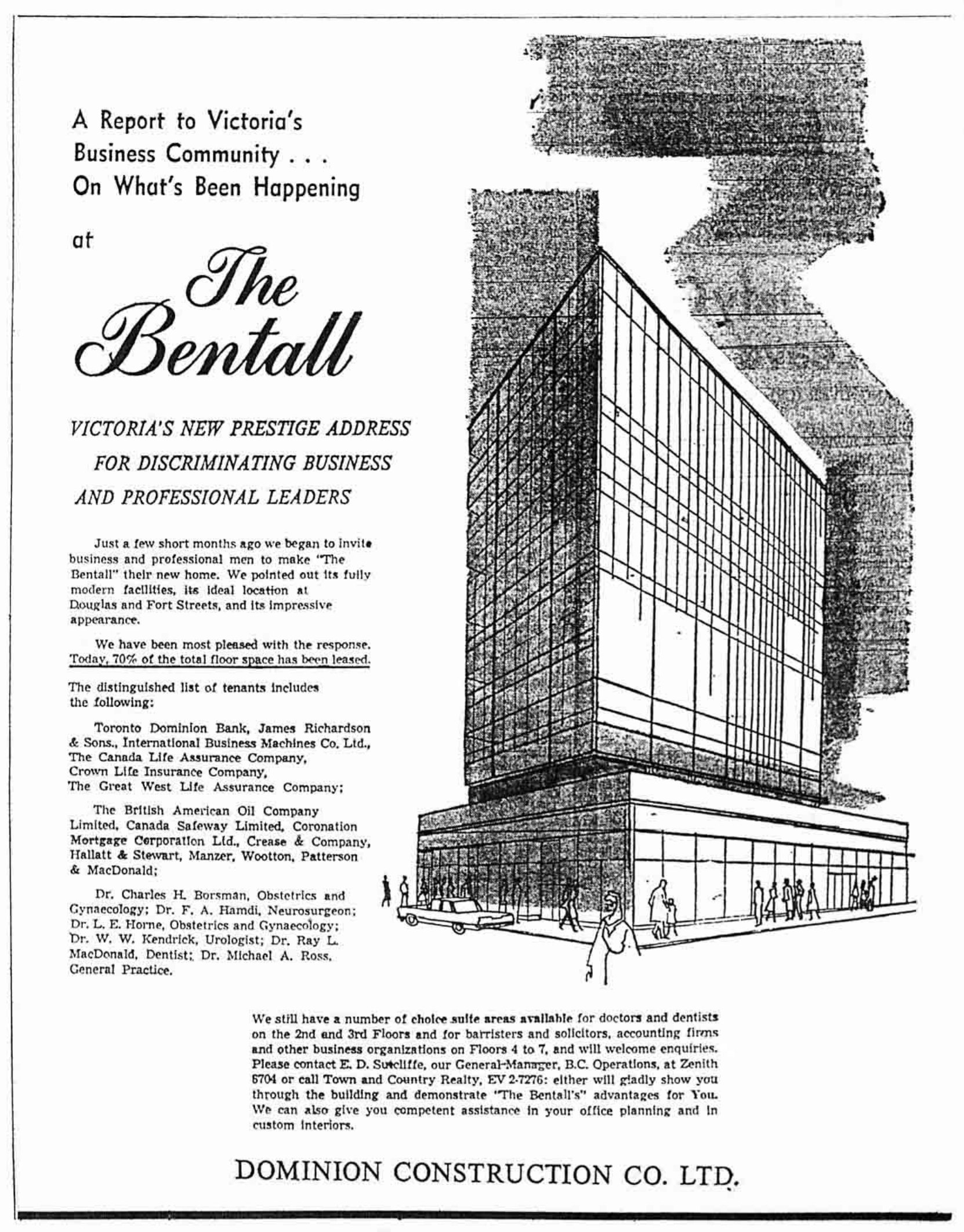 1964 advertisement for the Bentall Building at 1060 Douglas Street. The Bentall Building is now in the Canadian Register of Historic Places.