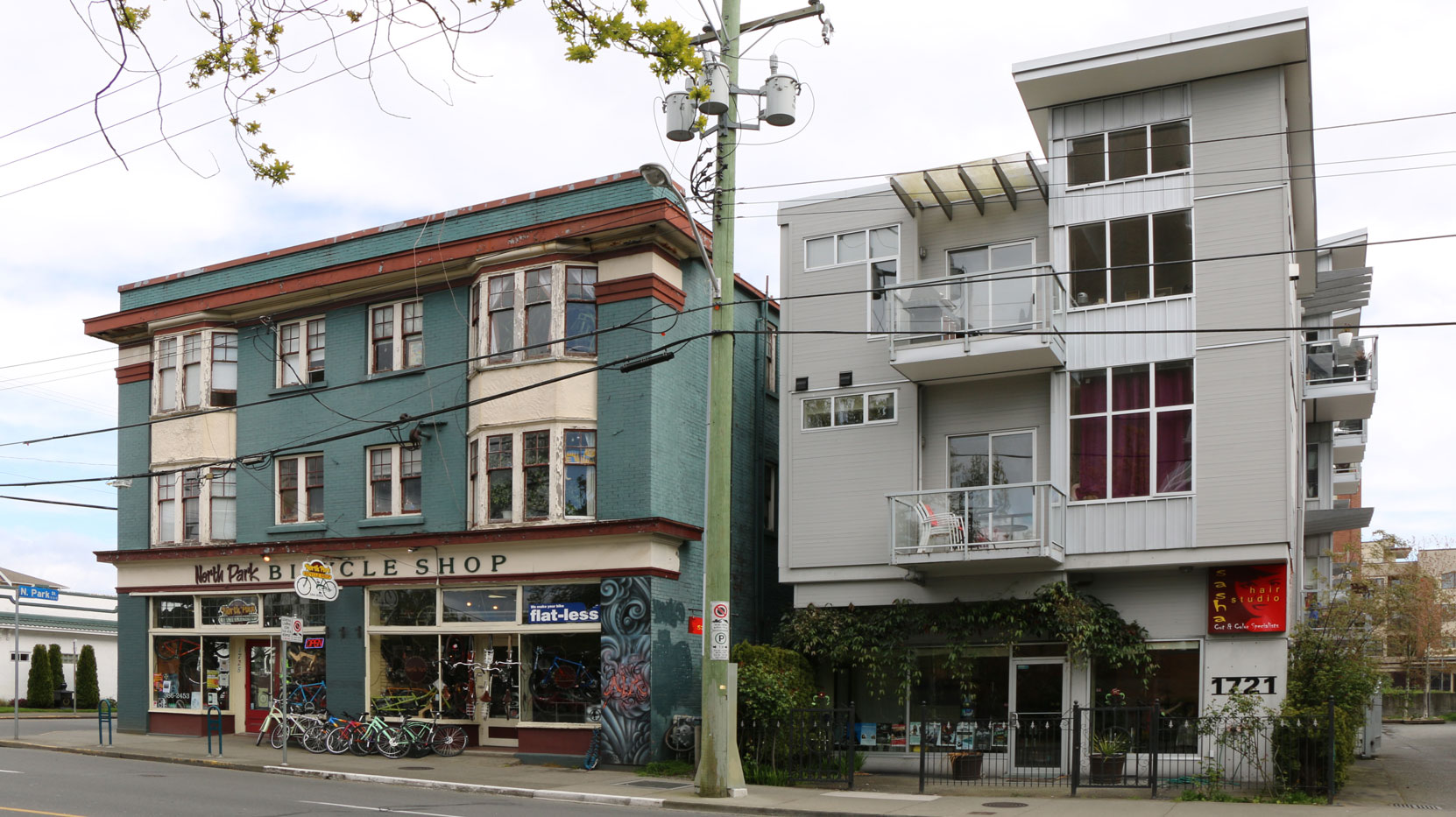 1721 Quadra Street (right), built in 2005, and 1723-1725 Quadra Street, built in 1914, and examples of three storey mixed residential/commercial buildings built ninety years apart. (photo: Victoria Online Sightseeing)