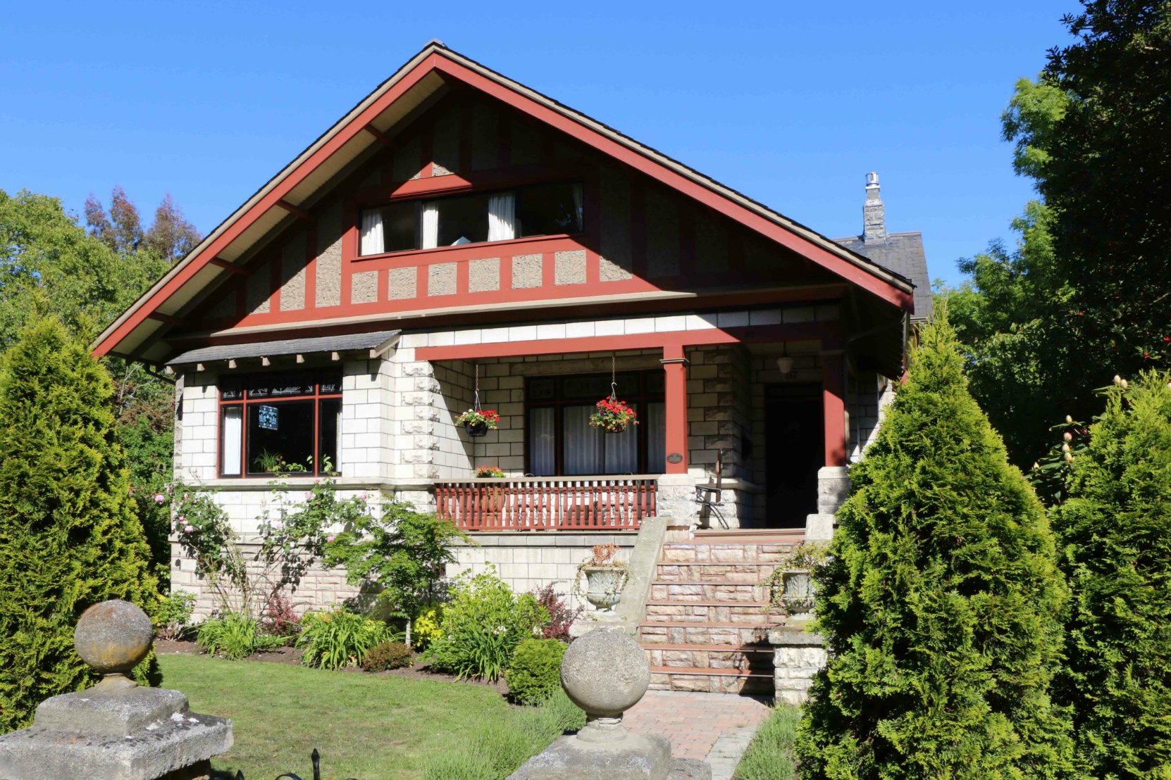 97 Cook Street is a classic early 20th century Craftsman Bungalow design but it is unusual in its use of building materials. Rather than using the wood construction typically used throughout Craftsman Bungalows, this house is built of concrete block and “artificial stone” of various textures and colours.