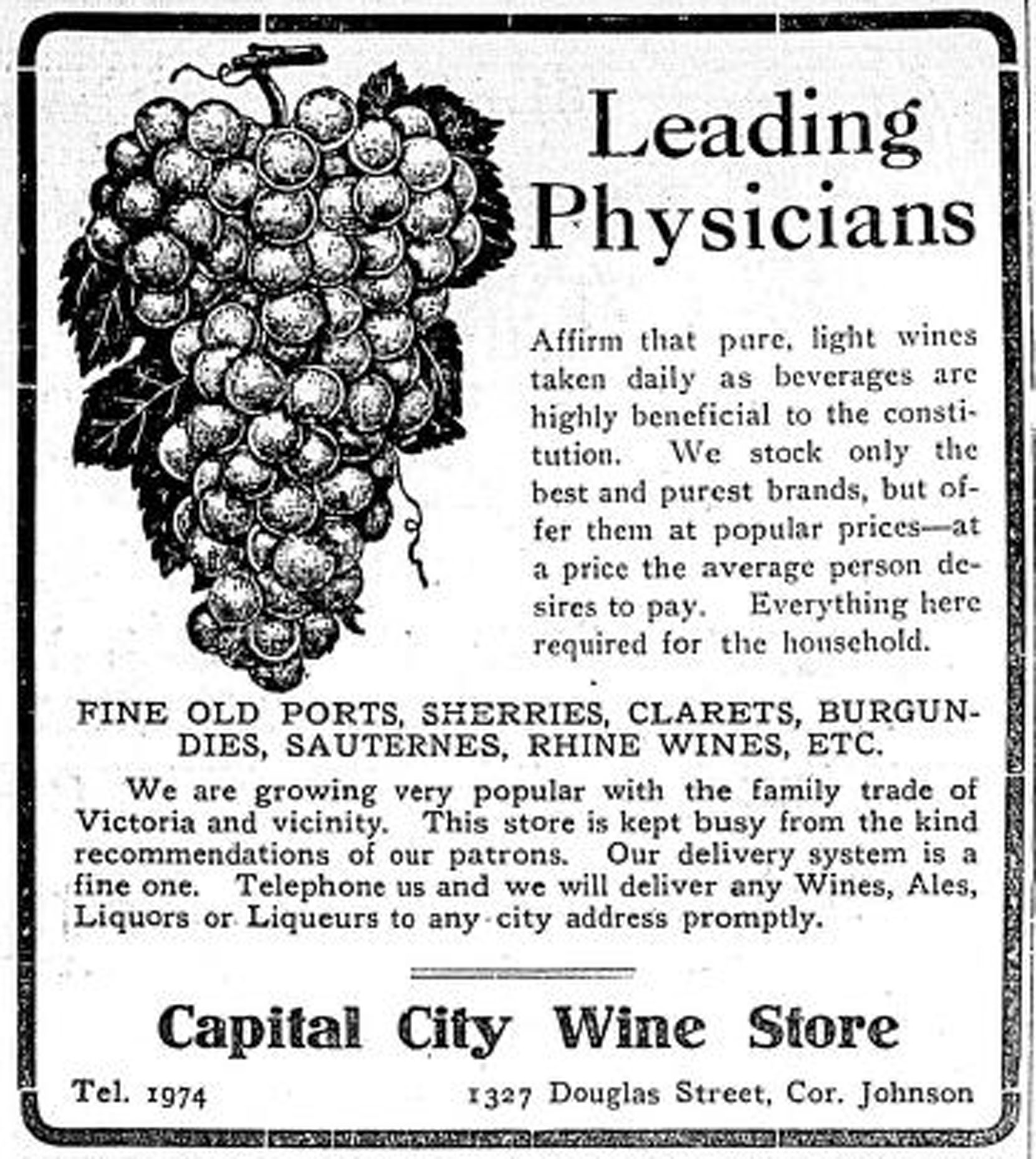1910 advertisement for the Capital City Wine Store, 1327 Douglas Street (Victoria Online Sightseeing Tours collection)