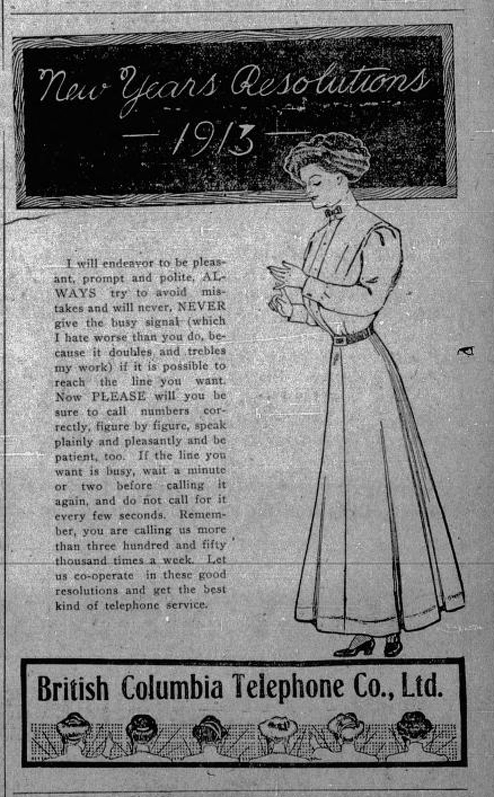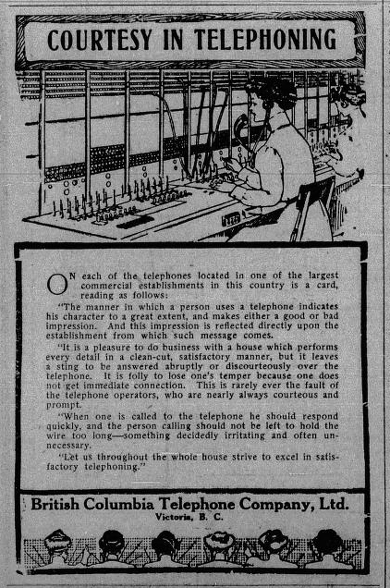 As part of our series on Historic Victoria Advertisements, Technology, 1910-1919, here are two 1913 advertisements from the British Columbia Telephone Company (now part of Telus Corporation), on the subject of telephone courtesy and etiquette.