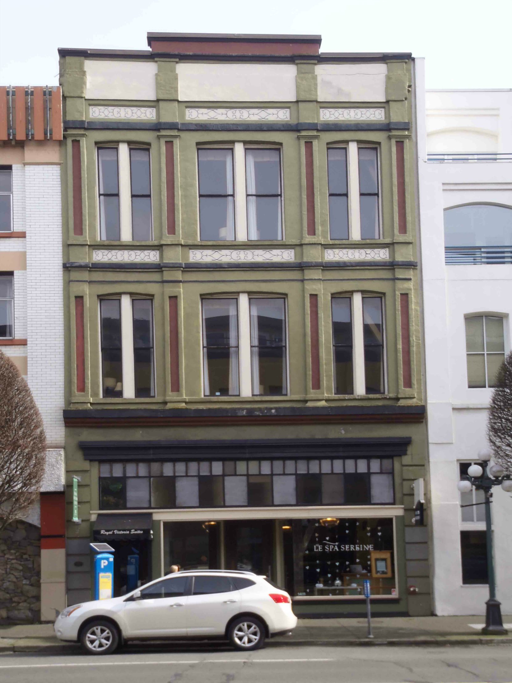 This building at 1411 Government Street was built in 1891, at an estimated construction cost of $9,000, for George Powell & Co., a hardware dealer. It is currently divided into 10 strata units, with one commercial strata unit on the main floor, or street level, with 9 residential strata units on the second and third floors.