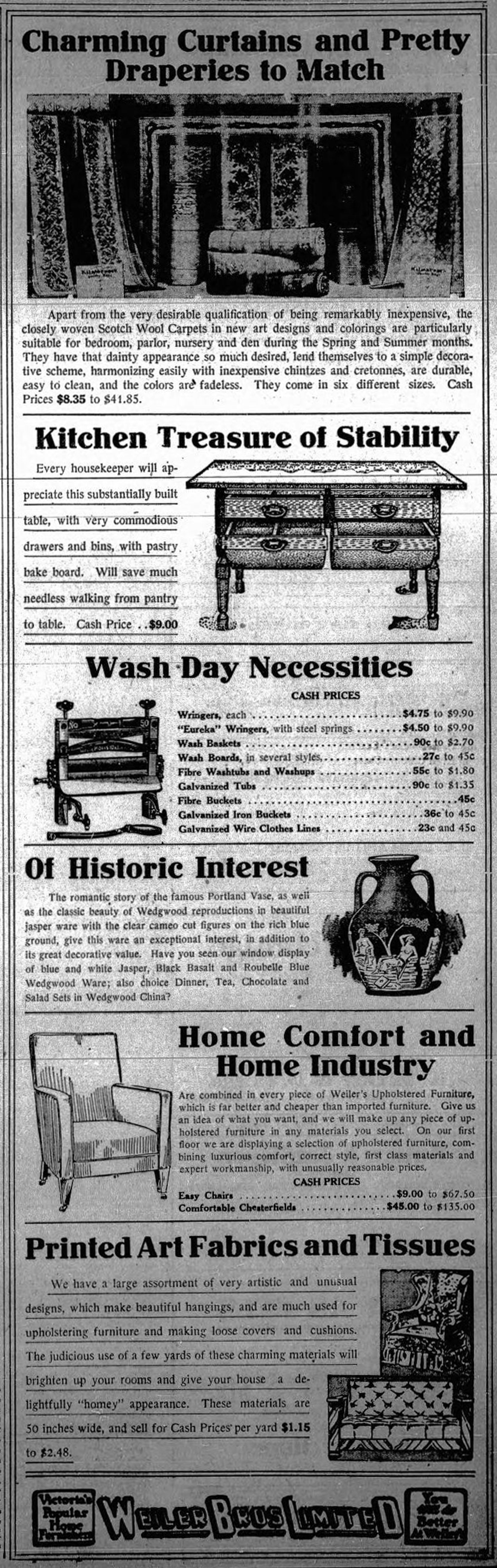 As part of our series on Historic Victoria Advertisements, Department Stores, 1910-1919, here is a 1915 advertisement for Weiler Brothers, which was located at 921 Government Street.
